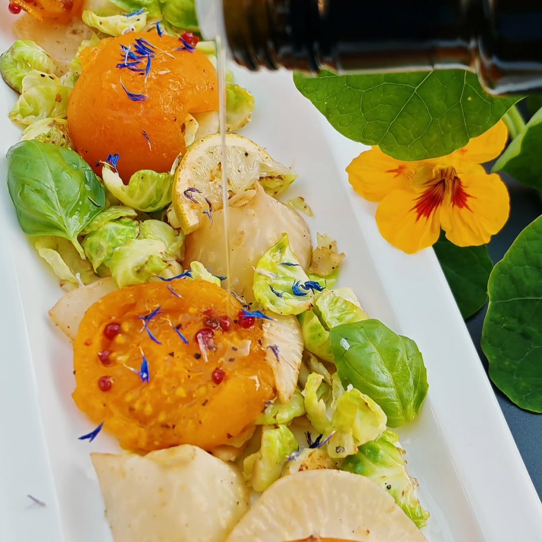 Gebratener Rosenkohl mit gelben Tomaten & Aprikosenkernöl