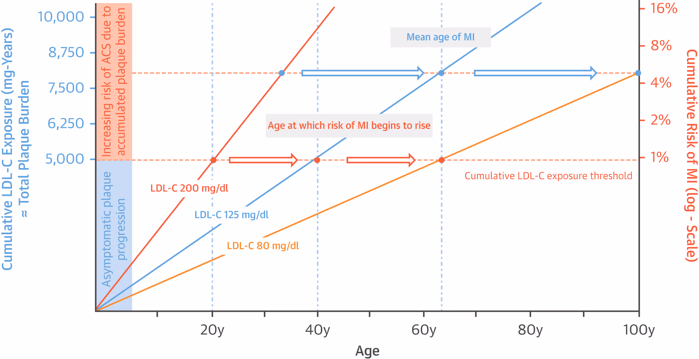 Die orangenen Punkte markieren das Alter, in dem Menschen mit einer lebenslangen Exposition von 200 mg/dl, 125 mg/dl bzw. 80 mg/dl den Schwellenwert von 5 000 mg-Jahren kumulativer LDL-Belastung überschreiten – ab dem das Lebenszeitrisiko für einen Herzinfarkt über 1 % liegt.