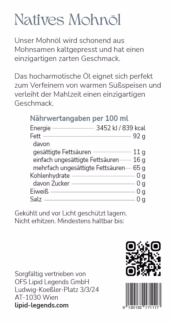 Dieses Verfahren sichert die Bewahrung der natürlichen Aromen und der wertvollen Inhaltsstoffe des Öls. Mohnöl ist bekannt für seinen intensiven, nussigen Geschmack und eignet sich hervorragend als Speiseöl zur Verfeinerung von Salaten und Kaltgerichten.
